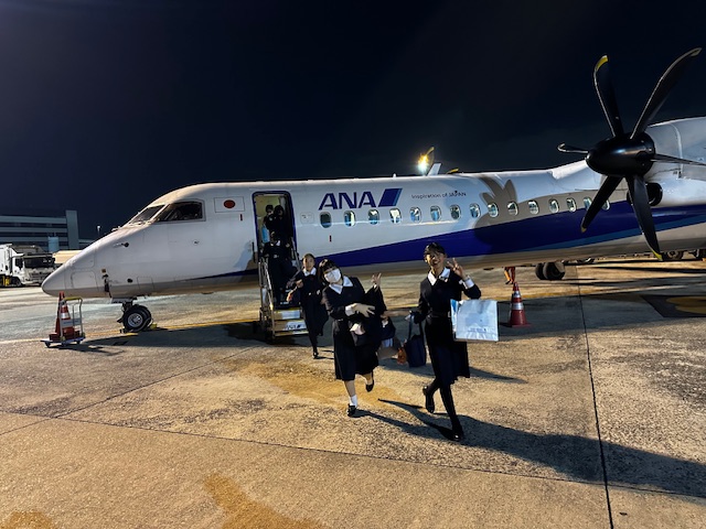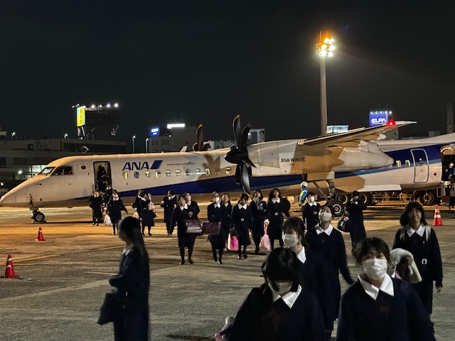 2日間の学びを終え、帰りは福島空港から飛行機で伊丹へ。行きは、ほぼ一日かかった大移動でしたが、帰りは、約時間の空の旅です。離陸直後は、少し気流の影響で揺れが激しく、ドキドキしましたが、後は順調に飛行し、伊丹空港に到着。出口のゲートにはお迎えの家族の姿も見られ、3日ぶりの笑顔での再会となりました。