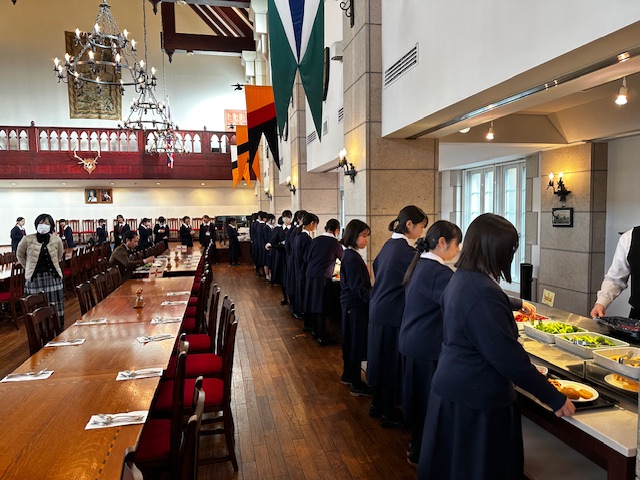お楽しみの夕食は、英語での説明を受けた後、各自ビュッフェ方式で好きな食事をとり、おいしく頂きました。