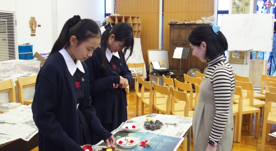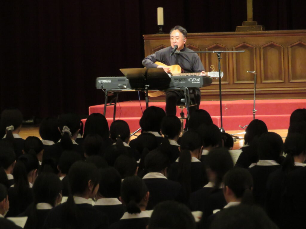 宗教週間の企画として、10月29日(水)の5時間目に「特別礼拝」を執り行いました。今回は音楽による礼拝の形をとり、シンガーソングライター兼、音楽プロデューサーであり、日本基督教団東美教会牧師もされている陣内大蔵先生に講話にくわえて、オリジナル曲を含む歌、数曲を聞かせていただきました。また別の日には、明石市にある「にじ作業所・パン工房「なないろ」のパン販売も2日にかけて行われました。また、放課後の時間を利用してクリスマスのリースと松ぼっくりで作る、ミニツリーのワークショップも行われました。そのほか、松蔭と関係の深い神戸聖ヨハネ教会のバザーで綿菓子屋・聖ミカエル教会のバザーでは、たこ焼き屋を出店しました。これも松蔭と関係の深い広島女学院高等学校が長年実施している「核廃絶の署名運動」に協力する形で、署名用紙を全校生徒へ配布し、協力を呼びかけました。また、各クラスがレオノラチャペルで外部からお招きした先生からお話を聴く、「宗教講話」も行われました。その他、毎年、宗教週間と同時期に図書館で、廃棄予定の本のチャリティ・ブック・バザーも実施されました。