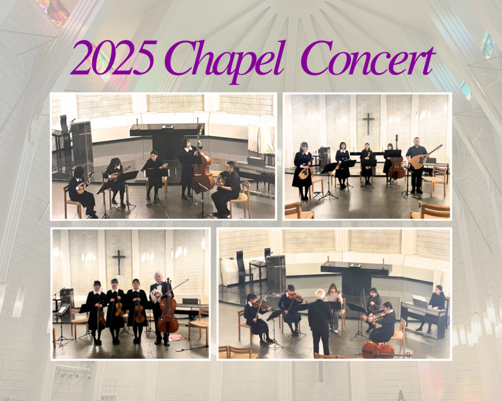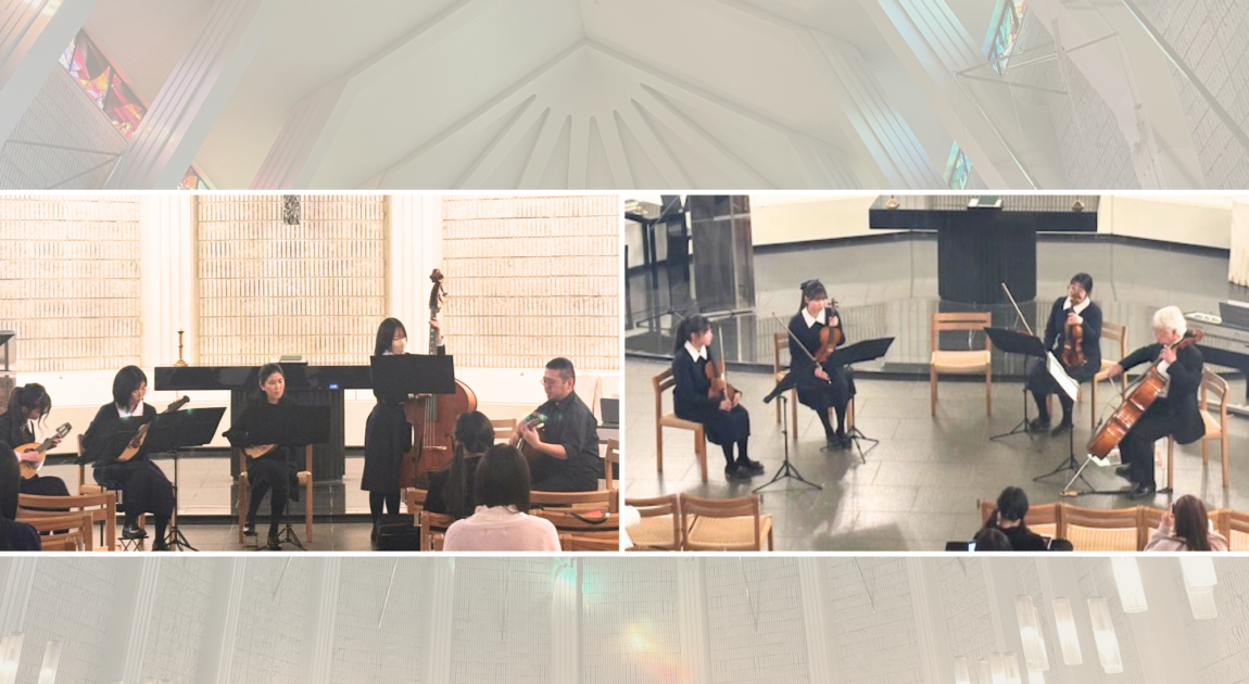12月20日にマンドリン同好会とバイオリン・アンサンブル同好会で、神戸松蔭大学のチャペルにて、チャペルコンサートを開催しました。家族や友人に見守られ、心温まるひとときを過ごすことができました。マンドリン同好会、バイオリン・アンサンブル同好会のメンバーにとって、思い出に残るコンサートになりました。