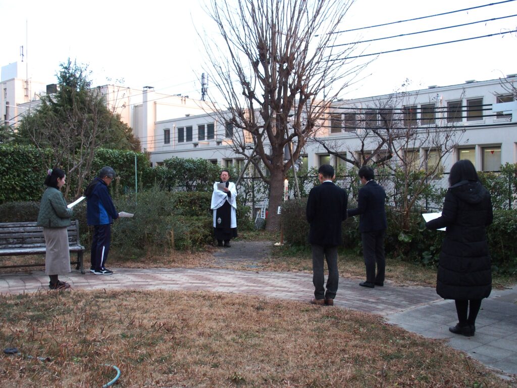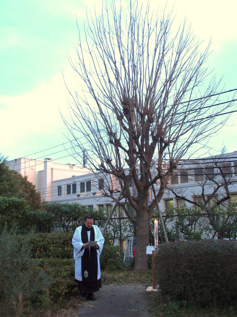 また、1月15日の放課後には、自由参加での「震災記念の祈り」も執り行われました。チャペルでの礼拝の後、震災を記念し、校内のモーブの広場に植樹された“楷の木”の前にてお祈りが行われました。ずいぶん大きく育った“楷の木”を前に、31年という月日の流れを実感する祈りの時となりました。