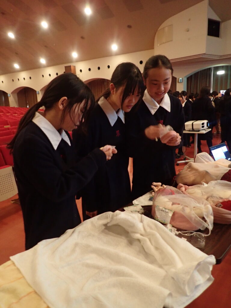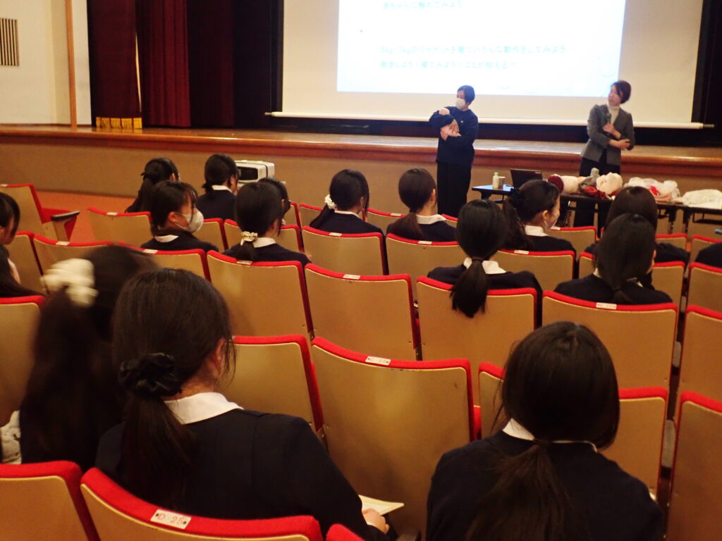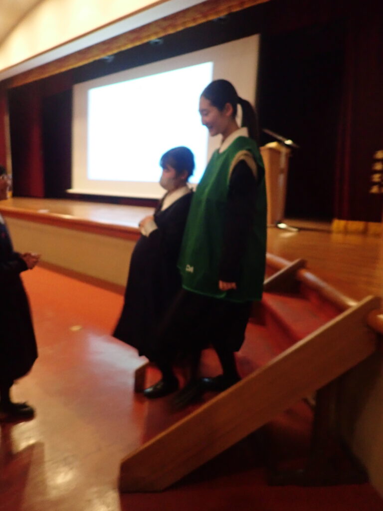 講演には、妊婦体験や赤ちゃん人形抱っこ体験といった活動も取り入れられ、積極的に参加している様子が印象的でした。楽しみながら学ぶことができ、生徒たちにとってとても良い経験であったと思います。