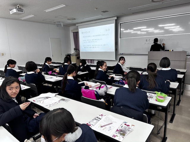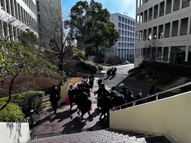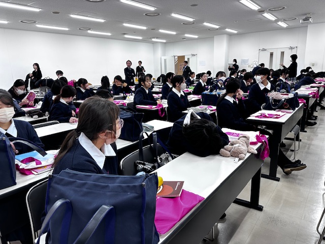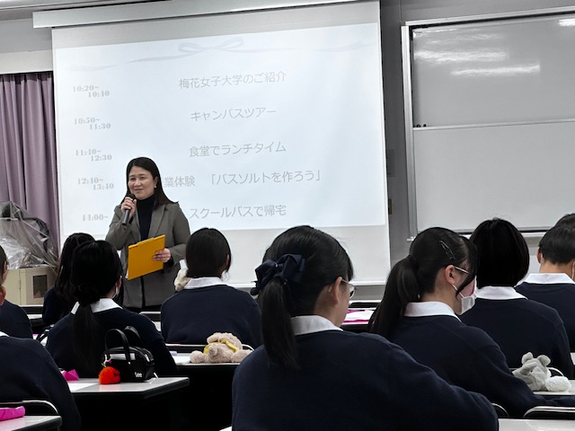 2月4日(水)、中学2年生DSの生徒たちが、大阪の茨木市にある梅花女子大学のキャンパスツアーに参加してきました。梅花女子大学は松蔭との連携校で、中学2年生のこの時期に大学とはどのようなものであるかを少しでも体感してもらおうと、進路指導部の企画として毎年行われています。今回も往路復路とも、梅花女子大学がスクールバス2台を出してくださり、楽しい見学と体験の1日を過ごしました。