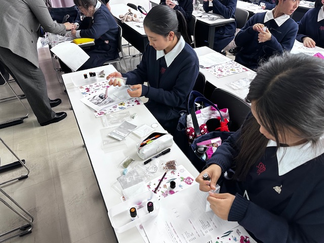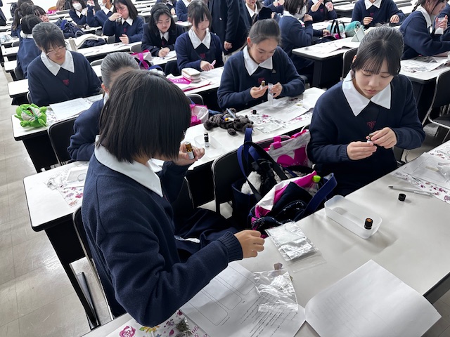 午後からは、再び大教室へ移動し、実習体験として、教授の先生の指導のもと「バスソルトづくり」を体験しました。自分の好みの香りを選び、作った「バスソルト」は、いいお土産になりました。