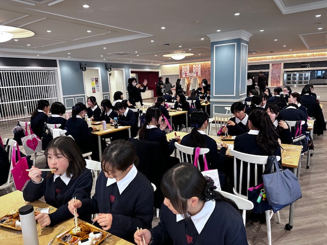 お昼の時間には、きれいな食堂で、梅花女子大学が用意してくださったお弁当をおいしくいただきました。食堂に設置されている化粧室は、女子大ならではで、百貨店のパウダールームのような美しいつくりでした!