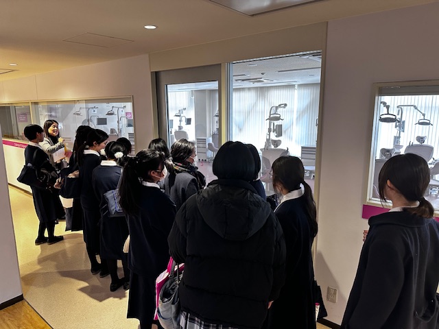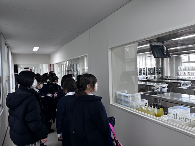 到着後、大教室で学校の概略の説明を受けた後、小グループに分かれて、校内の施設見学へ行きました。梅花女子大学は、学部、学科が多岐にわたり、理系や実技の学科も多いため、実験室や調理実習室のような設備が整った特別教室の見学に生徒は目を輝かせていました。