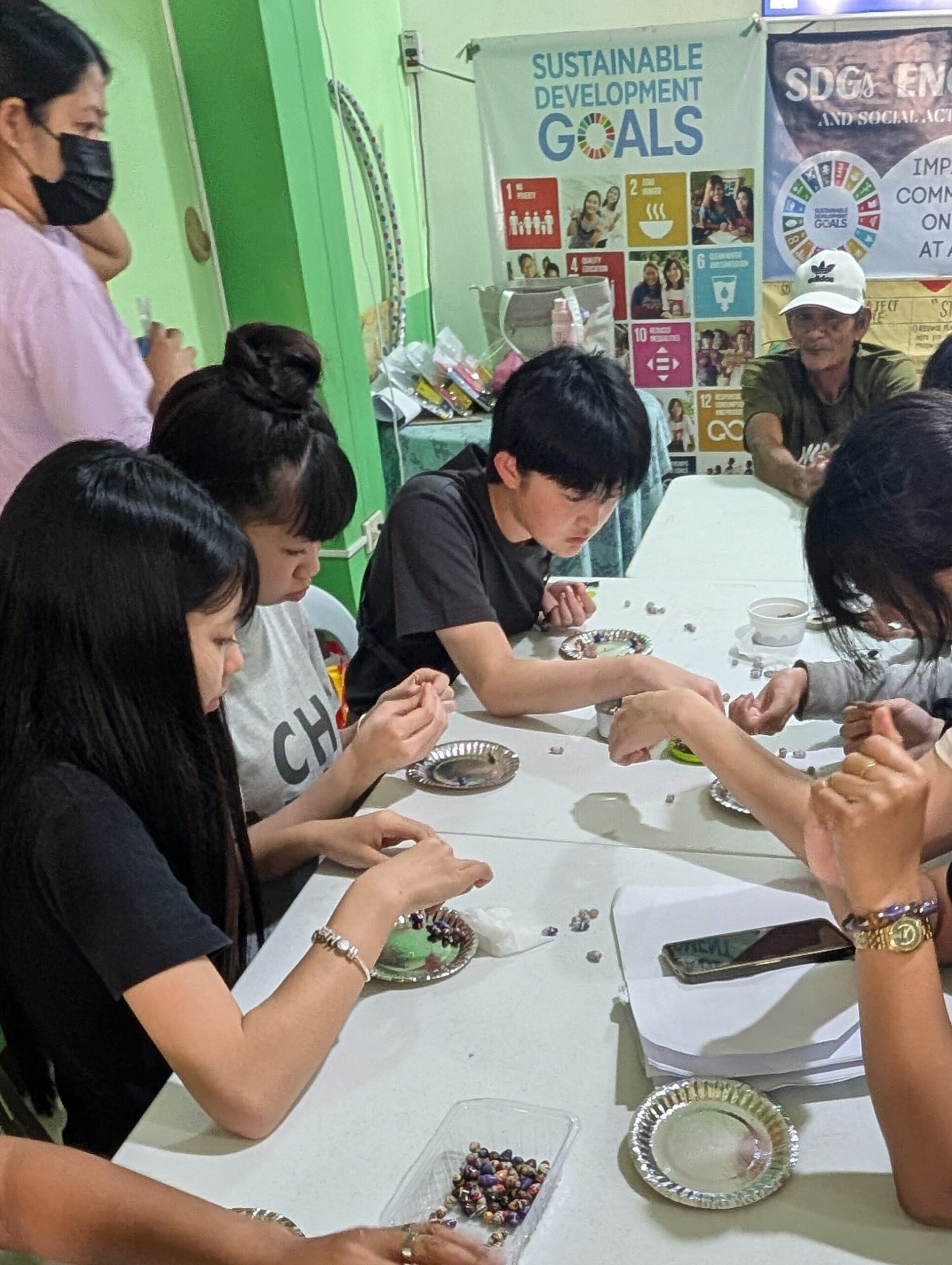今日は、フィリピンのゴミ問題について学びます。フィリピンにはゴミ焼却場がないためため、計画的に埋め立てるための集積場(サニタリーランドフィル)を見学に。過酷な環境を目の当たりにして衝撃を受けつつも、その中から人の手でゴミを分別して、アップサイクル品に加工することで、少しでもゴッミの量を減らすと同時に人々の収入源にもなるという取り組みも学びました。実際に雑誌のアップサイクル品、ペーパービーズ作りをしている方に教えてもらい、素敵なビーズアクセサリーを作りました。