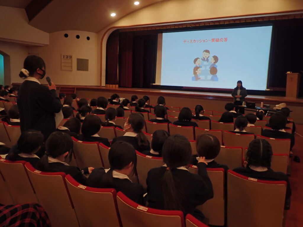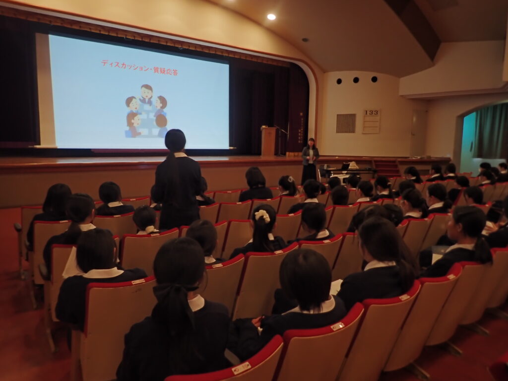 講演では、妊娠や出産に関する知識だけでなく、恋愛や健康、人生設計など、将来を考えるうえで大切な内容についてお話しいただきました。その中でも、恋愛についてのお話は、生徒にとって身近に感じるテーマであり、関心を持って聞いている様子が見られました。また、結婚や出産、仕事などの人生の選択について触れながら、将来のライフデザインを考える上で、正しい知識を持つことの大切さについてもお話しいただきました。講演の最後には、感想を共有し、先生に質問にもご対応いただきました。生徒たちが、自分自身の将来について主体的に考えるよい機会となりました。先生の言葉を心に留め、これからに活かしてほしいと思います。永原先生、心から感謝いたします。ありがとうございました。