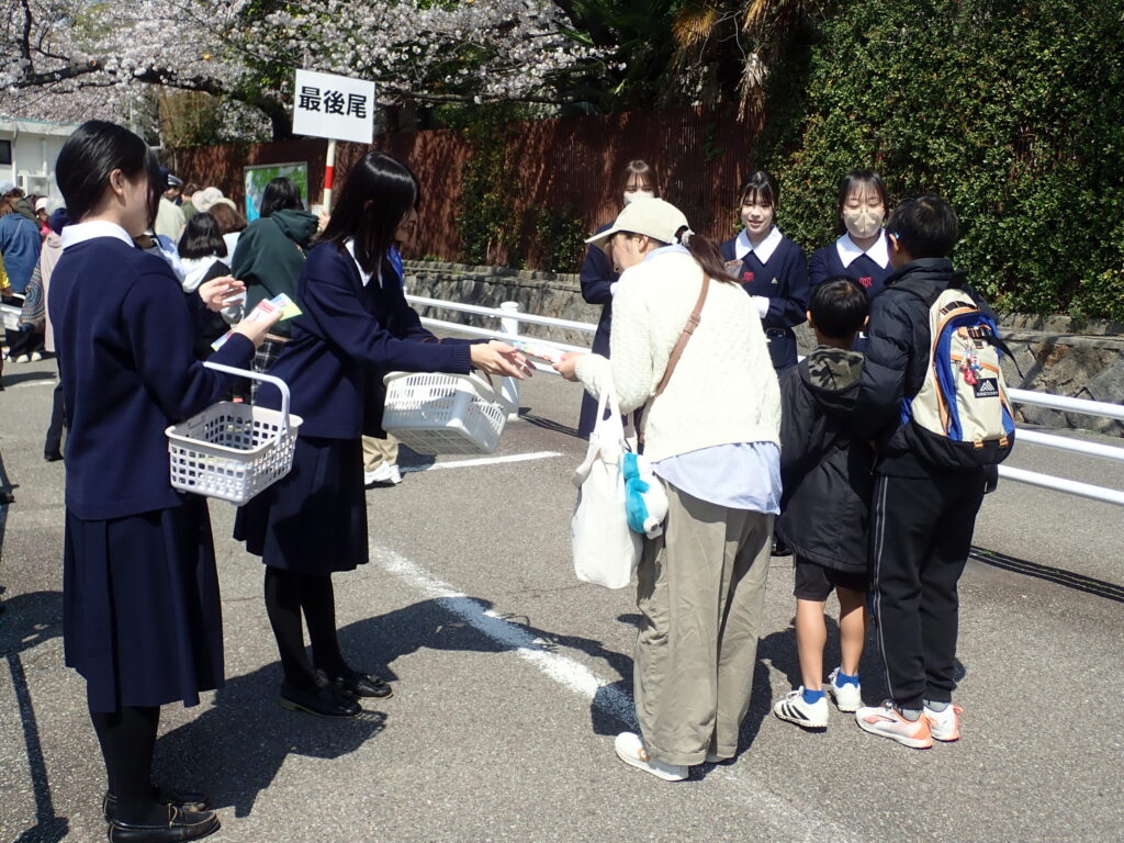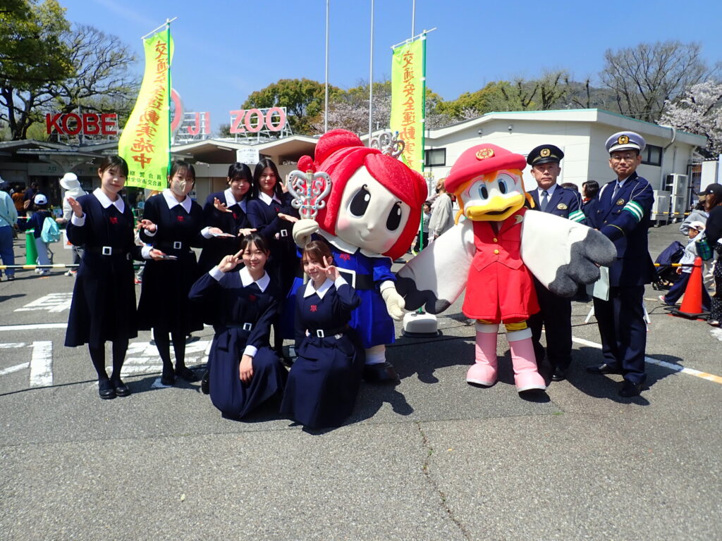 4月3日(水)今年度も生徒会の生徒とピーノちゃんが「春の全国交通安全運動プレキャンペーン」に参加しました。警察署や交通安全協会の方々と、神戸市立王子動物園の入場口前駐車場にて、交通事故抑止啓発チラシを配布し、交通安全を呼びかけました(サンテレビやNHKのニュースにも掲載されています)。参加した生徒は、「小さい子どもたちにも笑顔で呼びかけ、楽しく参加できた」「交通安全を考えるよい機会となった」と話しています。そして4月1日から、自転車への交通反則通告制度が導入されています。私たちも交通ルール・マナーを向上させ、交通事故を防ぎましょう。