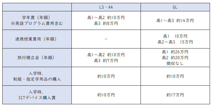 (GLについては、高1カナダ研修の費用を積み立ている関係で高額となっています。)