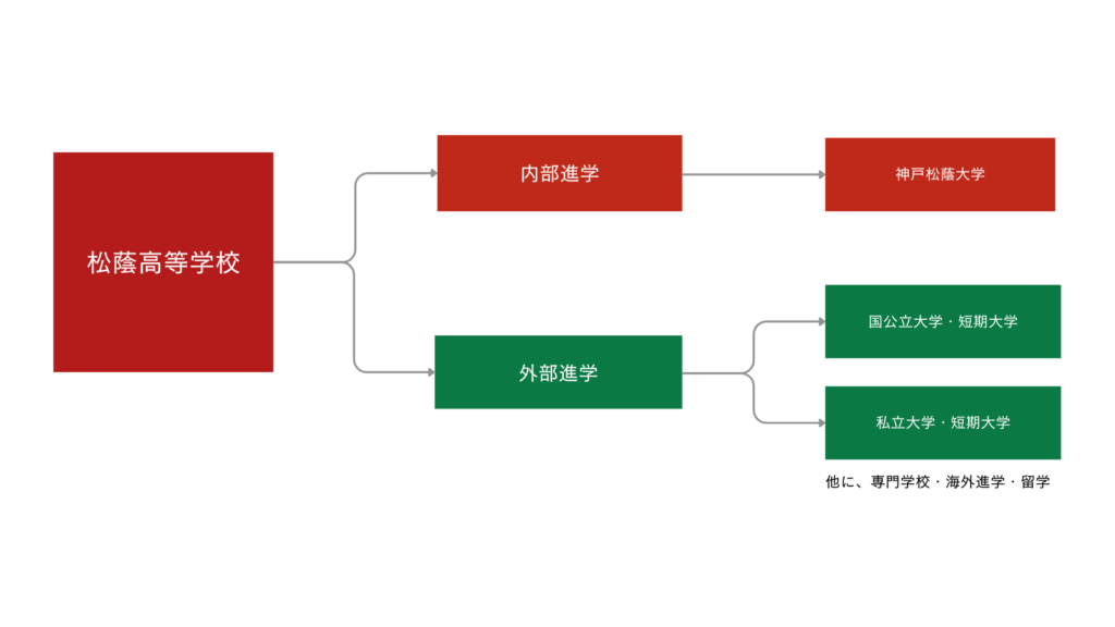 | 神戸松蔭大学への内部進学のメリット 【併願受験】 成績上位生徒(2025年度高3の場合、校内席次が在籍人数の2/3まで)は、神戸松蔭大学の特別推薦受験をし、合格を得た後、他大学の受験が可能。(特別推薦の合格後、入学金等の手続きは2月下旬までしなくてよい。) 【授業料軽減(専願者)】 専願者全員に、入学金が給付される。成績によっては、校納金の半額も最大4年間にわたり給付される。 |